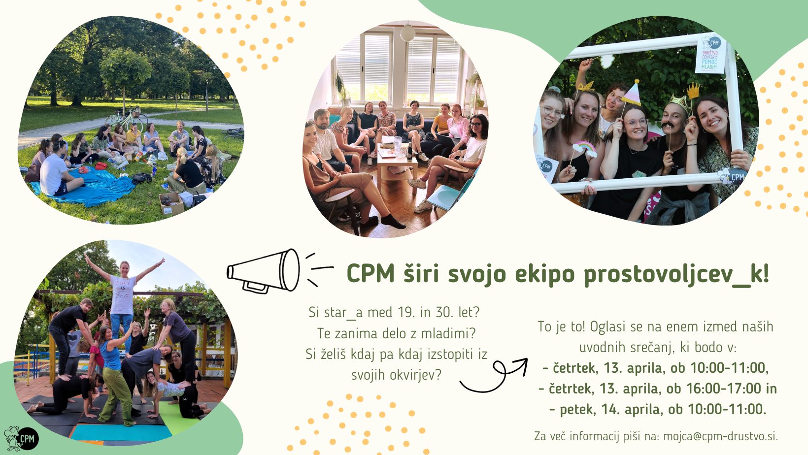 Prostovoljno delo pri njih zajema vodenje delavnic, treningov socialnih veščin in projektnega dela za mlade med 15. in 20. letom starosti. S tem jim omogočajo, da se v varnem in neobsojajočem okolju odprto pogovarjajo o njim pomembnih temah, se učijo drug od drugega in krepijo svoje potenciale za prihodnost. Vi pa poleg soustvarjanja z mladimi dobite še svoj prostor v njihovi CPM družinici, znotraj katere vas čaka učenje novih stvari, osebnostna rast, mednarodne izmenjave, veliko smeha ter ogromno popite kave in skupnih druženj.
