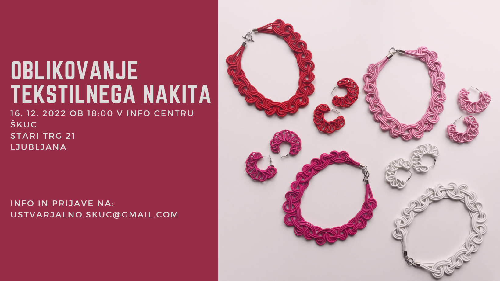Info center Škuc vabi na delavnico oblikovanja tekstilnega nakita, katero bo vodila Urška Sadar.