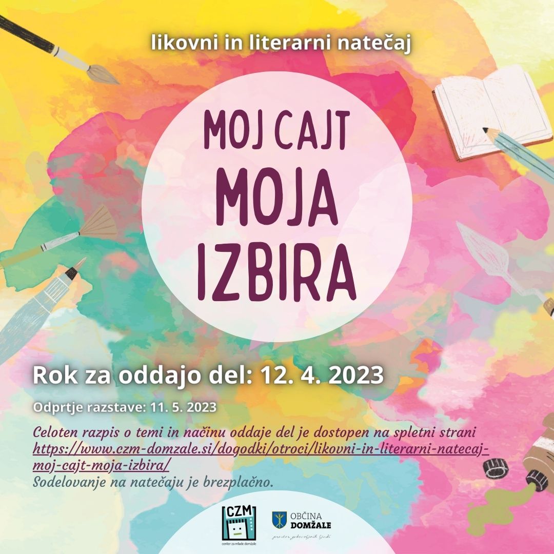 Center za mlade Domžale razpisuje likovni in literarni natečaj Moj cajt – moja izbira. Tema letošnjega natečaja so hobiji oz. prosti čas. Kaj rad/a počneš v prostem času? Kaj te veseli in navdušuje? Brez česa si ne predstavljaš življenja? K sodelovanju vabijo vse, ki radi ustvarjate in/ali pišete. Sodelujete lahko tako z likovnimi kot literarnimi deli, in sicer v treh starostnih kategorijah: