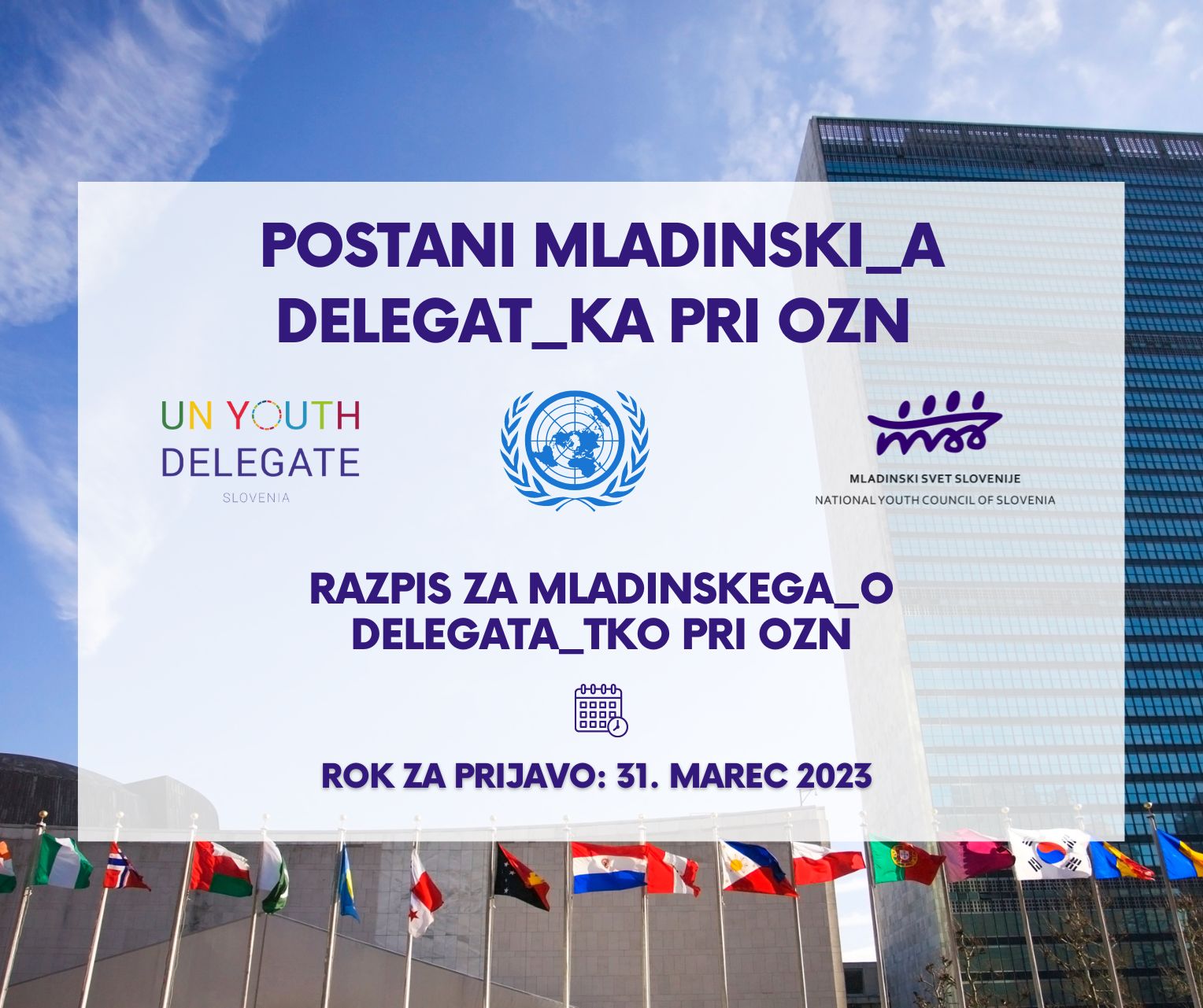 Z namenom spodbujanja participacije mladih na mednarodni ravni Mladinski svet Slovenije objavlja javni razpis za izbor mladinskega delegata pri (OZN).