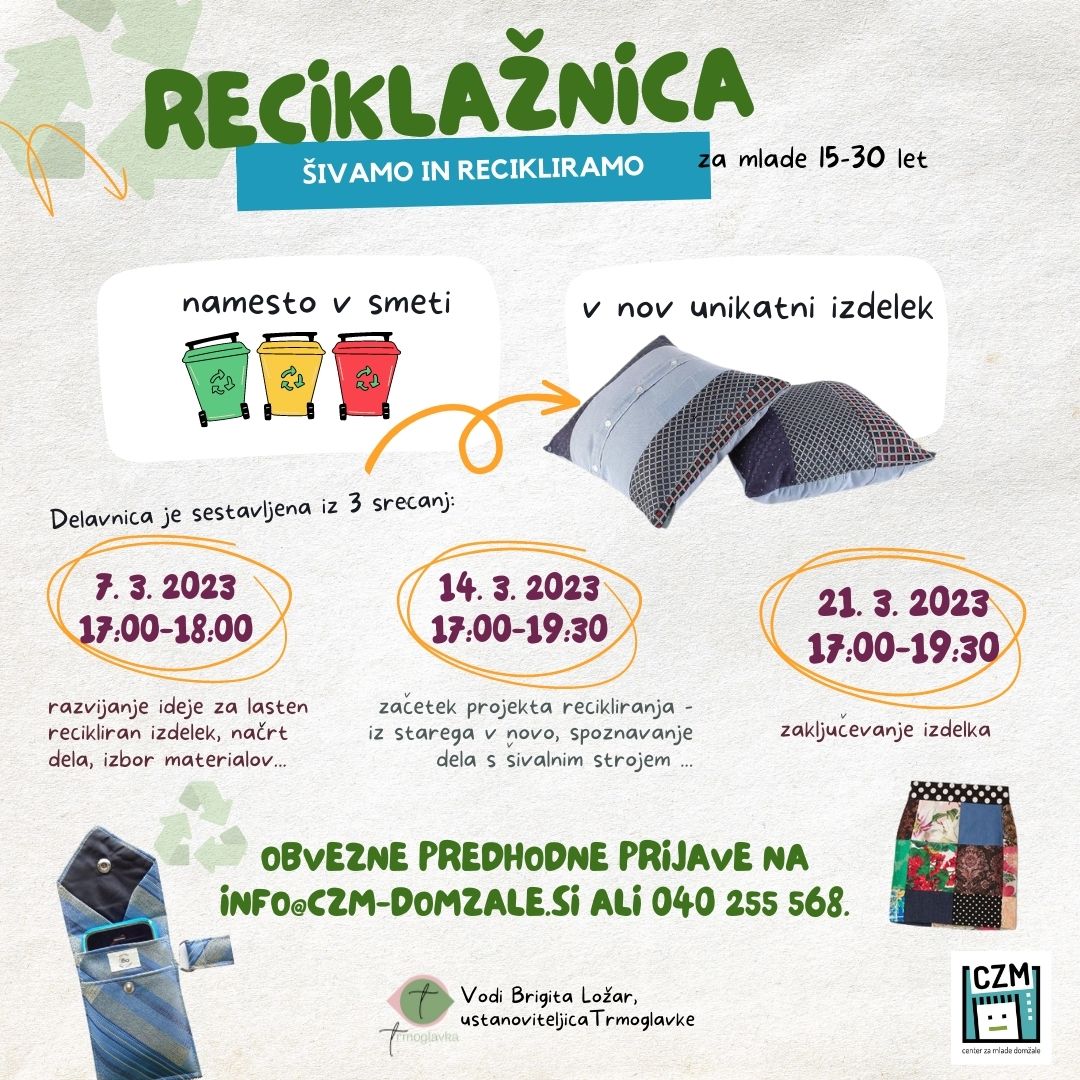 Prijavite se na delavnico reciklažnice, ki bo potekala v Centru z mlade Domžale. Na delavnici boste iz starih oblačil naredili nove uporabne predmete, se naučili uporabljati šivalni stroj in spoznali proces načrtovanja dela. Še nimate ideje za izdelek? Nič hudega, prvo srečanje bo namenjeno razvijanju ideje za vaš lasten recikliran izdelek. Delavnico vodi Brigita Ložar, ustanoviteljica Trmoglavke.